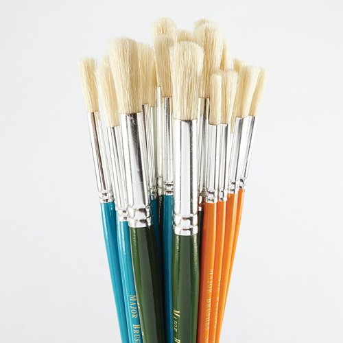 - These economical, short handle paint brushes are ideal for classroom use and various art projects. These hog hair paint brushes can be used with nearly all paint types, including ready mix, oil, and acrylic. This pack of assorted round hog hair paint brushes includes ten each of sizes eight, ten, and fourteen, making it versatile for varied art techniques. The brushes feature durable, easy-to-clean coloured handles, ensuring they stay in excellent condition after numerous uses. The hog hair bristles are firm and suitable for several paint types, including acrylic, oil, and ready mix, providing ample flexibility for different art projects. These aspects make them perfect for various classroom tasks and for stimulating creativity in children. Designed with short handles, these brushes are easy to grip and balance, supporting dexterity and control for children at different skill levels. This variety of sizes and firm bristles ensures that the curriculum can offer a broader and more equal experience of art activities to all children.
