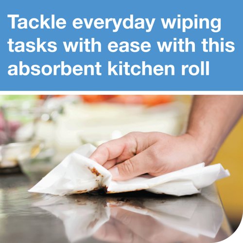 Suitable for wiping and drying kitchen surfaces and equipment, this Tork kitchen roll is soft, strong and absorbent for efficient use with less waste. The 2 ply white paper can absorb water, oil and food remains for cleaner working surfaces. Each roll is 15.4m long and contains 64 embossed sheets. Ideal for cleaners, caterers and shared kitchens, this bulk pack contains 24 rolls (12 packs of 2 rolls).