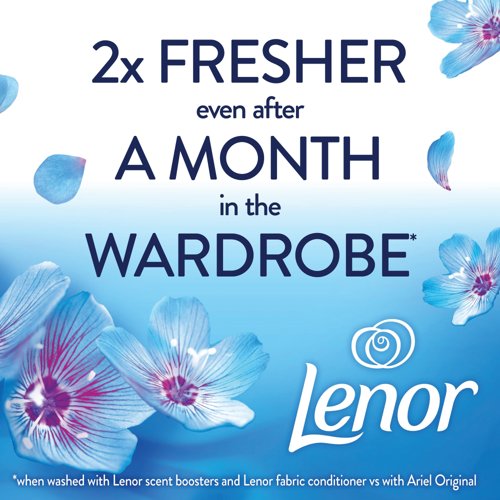 - Lenor In-Wash scent booster with a clean fragrance, inspired by accords of herbal green scents and sea water like accords water of the sea, floral notes of Lily of the valley and effervescent citrus. The beads are added directly to the empty washing machine drum before adding laundry, providing a boost of non-stop freshness for laundry for up to 12 weeks in storage. Suitable for all types of fabrics, these booster beads are supplied in a 420g bottle.