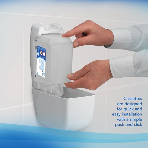 | Compatible with Aquarius™ hand cleanser dispensers (product codes 6948, 6955 and 7124). The cassettes are designed for quick and easy installation with a simple push and click. When the cassette is empty, it can be compressed to conserve space and is fully recyclable once the pump is removed |