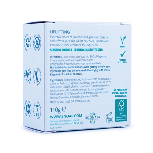 - The Snoap refill for the Snoap dispensers is an environmentally friendly alternative to liquid soap. Free from plastic, the refill is in block soap form and packaged in a cardboard box. Featuring evocative notes of Lavender and Geranium, this Snoap will cleanse and refresh your skin whilst patchouli, sandalwood and exotic spices enhance the experience.