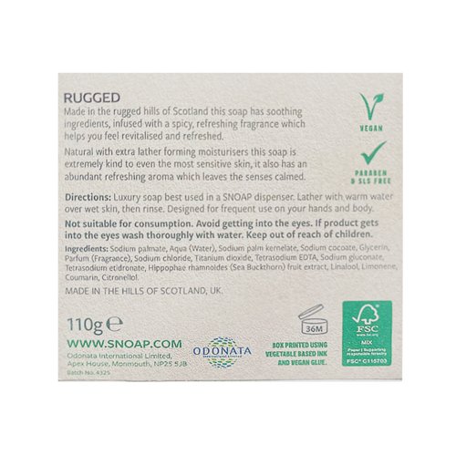- The Snoap refill for the Snoap dispensers is an environmentally friendly alternative to liquid soap. Free from plastic, the refill is in block soap form and packaged in a cardboard box. Made in the rugged hills of Scotland, this soap has soothing ingredients, infused with a spicy, refreshing fragrance which helps hands and body feel revitalised and refreshed.