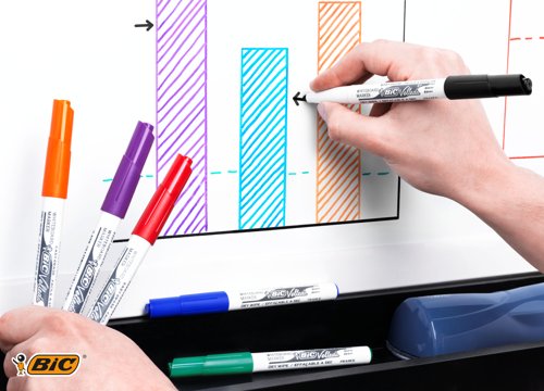 These Bic Velleda Whiteboard Markers feature ketone-based ink that glides on smoothly and erases just as easily, and is low odour to ensure comfort when writing extensively. It features a strong acrylic tip that will not bend or retract into the barrel, even with heavy use. The bullet tip writes a consistent bold line for ease of use.