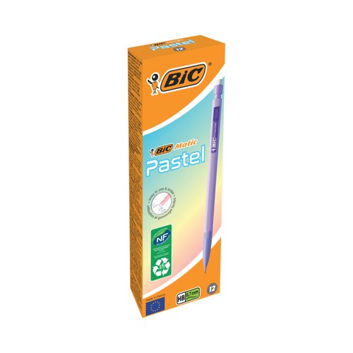- This Bic Matic mechanical pencil with strong 0.7mm HB lead for writing, drawing and sketching is lightweight and writes smooth, dark lines. Made from 57% recycled materials, the pencil features a comfortable design with built-in eraser for use at home, school, or in the office. Each pencil comes with 3 x 90mm HB leads which are great for all writing tasks. This pack contains 12 mechanical pencils in the pastel colours of purple, pink, blue, green and lilac.
