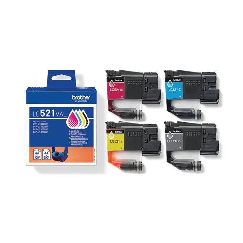 The Brother LC521VAL multipack (including black, cyan, yellow and magenta ink cartridges), ensuring consistent, high-quality printouts from start to finish. With our precisely formulated inks, your printer will perform at its best throughout its lifespan.