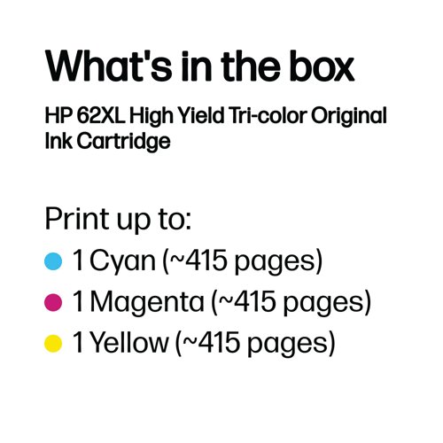 - For reliable performance and consistent, outstanding results, choose HP original ink cartridges. Designed and tested for optimal results, these HP 62XL cartridges are supplied as a complete print head and ink unit and are designed to prevent clogging and corrosion. Producing vivid colour documents and lab-quality photos that dry quickly, the HP 62 XL Tri-color cartridge also has an impressive page yield of 415 pages.
