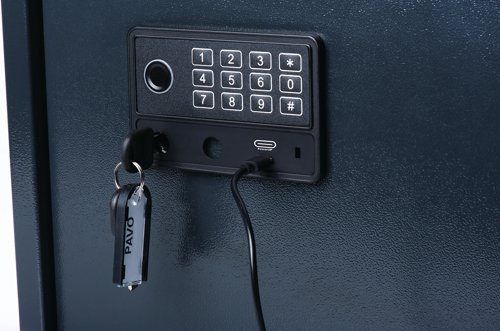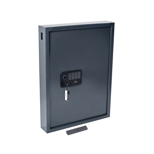 - This Pavo Magnettag Steel Key Cabinet is a durable key cabinet with fingerprint and electronic lock, supplied with two emergency keys. Three locking options are available with the cabinet - fingerprint, electronic and emergency key. With a 50 key capacity within this dark grey cabinet, it also has a USB-C type connector and dimensions (W x D x H) of 400 x 80 x 550mm.