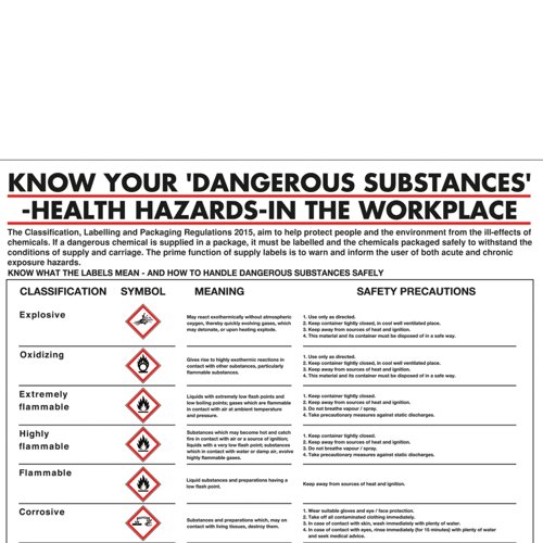 - This poster includes a breakdown of all dangerous substances regulated under the Chemicals (Hazard Information and Packaging for Supply) Regulations Act 1994, including classification, label symbols, meaning and necessary safety precautions. An essential addition for warehouses and storage facilities. Made from tough, rigid plastic, it can be easily fixed to walls and noticeboards for maximum visibility.
